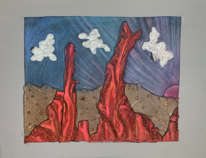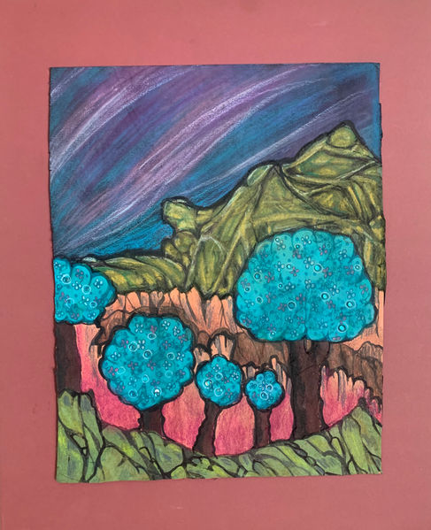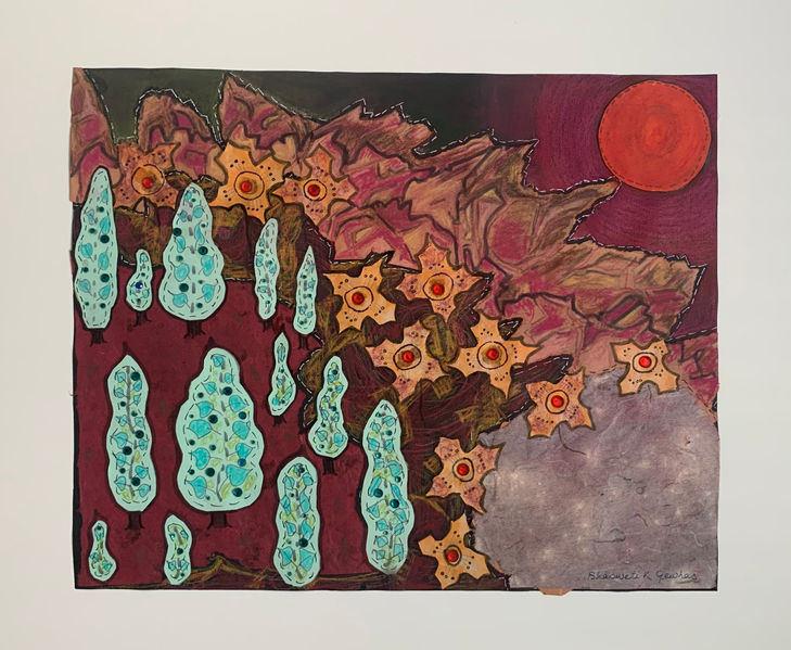"My landscape paintings are depicting diverse natural environments, the beauty of nature of different states of US. These landscapes represent vibrant energy of nature, based on a folk-art style form from India, using paper collage with mixed media painting; the style is very simple and rustic. This technique represents Shisha Work where Indian artisans in villages use broken mirrors, sequins in their art works. I used brilliant colored sequins and other materials to represent dazzling, alive, fresh life force energy of nature; in plants, water, stars, sun, birds and raindrops to bring the dynamics of alive nature in my art. This series of landscapes resonated in my heart as “Journey to Peace”